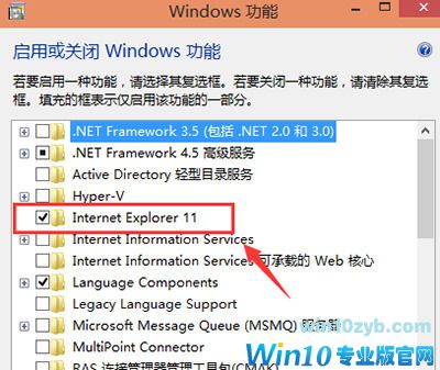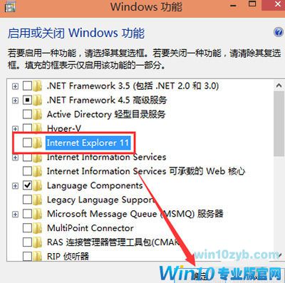 4、点击后弹出Windows功能对话框,找到Inetrnet Explorer 11,点击前面的勾勾,将其勾勾去掉,如下图所示。