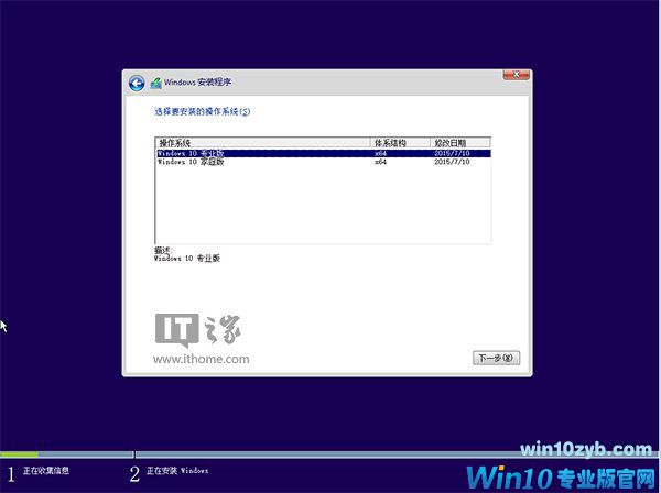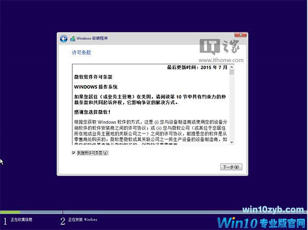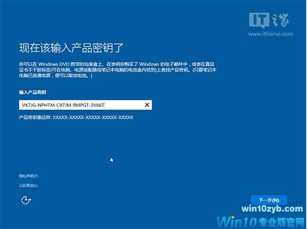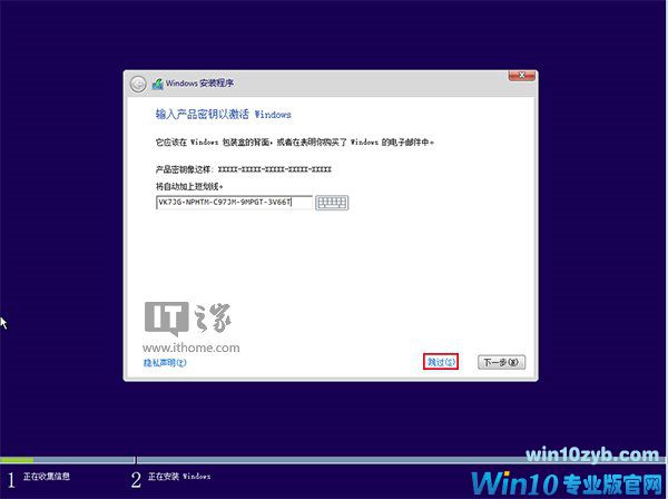 ▲此处可用安装密钥VK7JG-NPHTM-C97JM-9MPGT-3V66T(只用于专业版安装,激活无效),输入后点击“下一步”继续;也可以点击“跳过”,在安装完成后输入激活密钥
