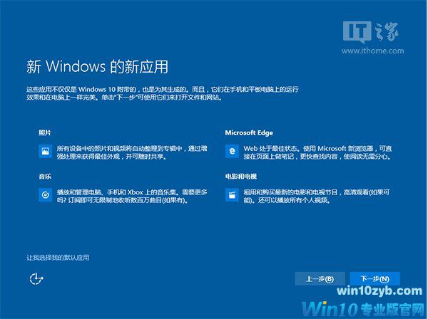 ▲为新用户简要介绍Win10的新应用,可在左下角选择默认应用。点击“下一步”继续