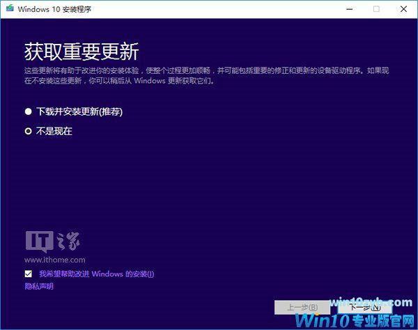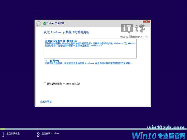 ▲这里可随意选择,如果时间紧迫可以选择完成Win10安装之后再更新。点击“下一步”继续