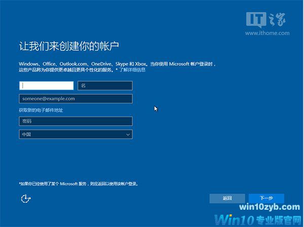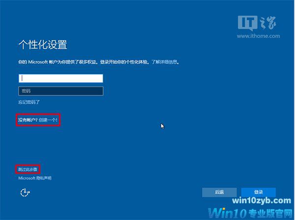 ▲输入你的微软账户信息后登录Win10。如果你没有微软账户可以点击屏幕中间的“创建一个”,也可以点击左下方“跳过此步骤”来使用本地账户登录