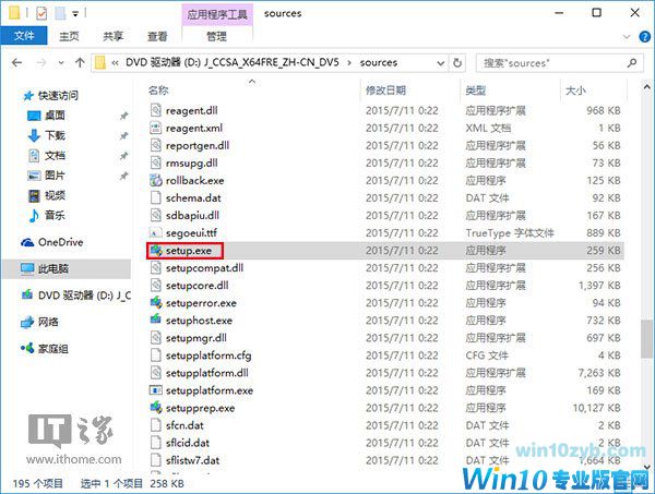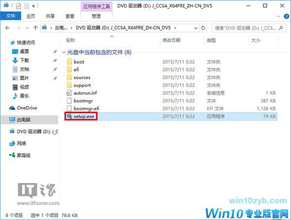 我们以Win10专业版安装为例,下载镜像后,打开ISO镜像。Win8/Win8.1中直接双击即可,Win7中可用软媒魔方的虚拟光驱)加载,直接运行镜像根目录中的setup.exe,如下图所示。