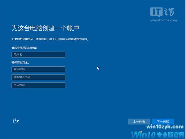 ▲本地账户创建页面,和Win7安装类似,填写用户名并且设置密码和密码提示后(必填),点击“下一步”即可