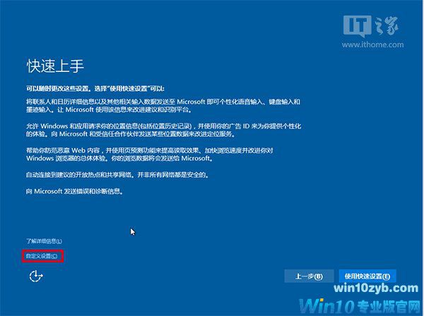 ▲对Win10进行个性化设置,你可以直接点击右下角的“使用快速设置”来使用默认设置,也可以点击屏幕左下角的“自定义设置”来逐项安排。我们点击“自定义设置”来看一下究竟有哪些详细设置