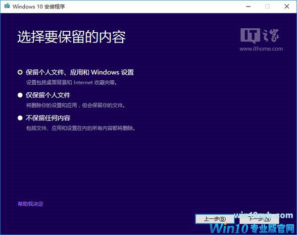 注意,无论选择哪个选项,升级后当前系统都会被Win10正式版替代。其中的“个人文件”是指“用户”文件夹下的内容;具体哪些应用可以保留取决于这些应用在Win10中的兼容性;如果选择“不保留任何内容”,升级后“个人文件”仍会被保存下来,移至名为Windows.old的文件夹中。