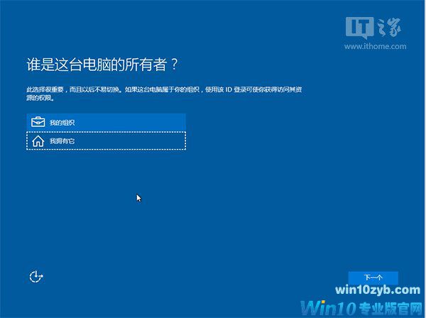 ▲选择当前设备的归属,如果是个人用户,选择“我拥有它”;企业和组织用户可选择“我的组织”后点击“下一步”继续
