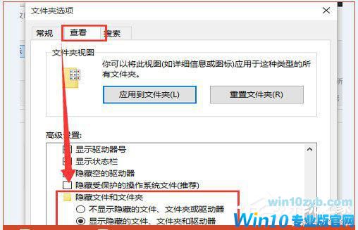2、在弹出选项卡中,点击"查看",并滚动滚动条,选中"显示隐藏的文件、文件夹和驱动器",点击确定并退出;