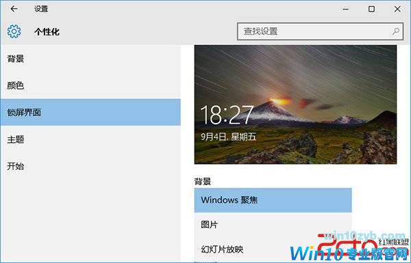 4、回到win10设置界面,依次点击个性化>>锁屏界面,在锁屏界面设置界面中将背景下的Windows聚焦功能可能修改为其他选项,因为Windows聚焦功能会导致CPU使用率高。