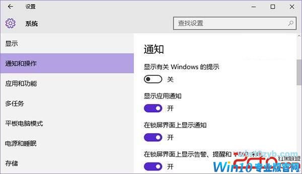 5、Windows聚焦功能关闭后,我们回到设置界面,依次点击系统>>通知和操作,在通知下方有一个显示有关Windows的提示选项,将该选项的状态设置为关闭状态即可彻底解决win10专业版CPU使用率高的问题。