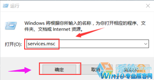 1.按键盘快捷组合键win+R打开运行程序,在运行处输入 “services.msc” 并回车确定。
