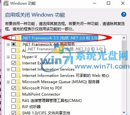 3、出现下面的对话框,找到第一个 .NET Framework 3.5(包括.NET 2.0和 3.0) 点击前面的小方框,再点确定。