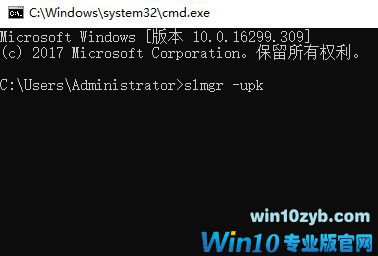 2、在命令提示符中键入:slmgr -upk,回车(清空原有密钥),如图: