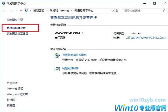 二、打开网络共享中心后,点击左侧的“更改适配器设置”,如下图所示。