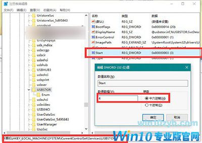 2、进入Win10注册表如下键值:HEKY_LOCAL_MACHINESYSTEMCurrentControlSetServicesUSBSTOR 在右边里面选中start 这个键值并且双击鼠标进行编辑,把默认值3改成4。