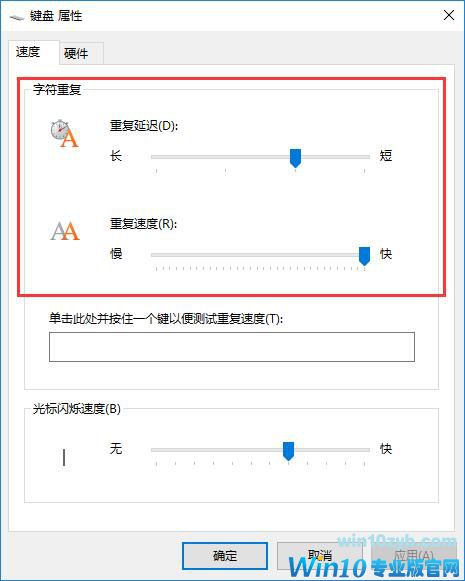 3、打开的键盘属性设置中,就可以看到键盘速度设置了,包括重复延迟、重复速度快慢等等,如果您打字速度足够快,可以将重复延迟时间设置的更短一些,这样有利于提升打字速率,随后点击确定即可。