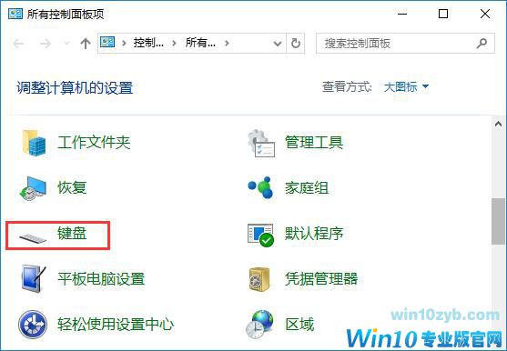 2、打开控制面板后,先将查看方式的类别选择为“大图标”,找到“键盘”并点击打开;