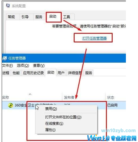 3、点击”启动”标签卡, 点击”打开任务管理器”,禁用全部启动项;