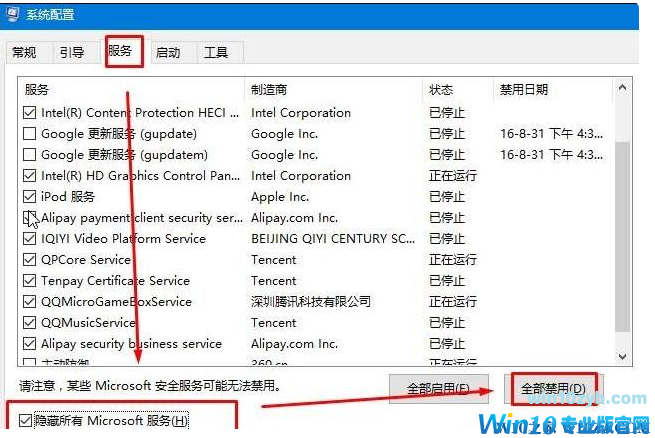 2、点击”服务”标签卡,勾选“隐藏所有的微软服务”,然后点击【全部禁用】;