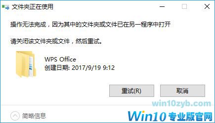 在win10系统中有用户反应在卸载金山WPS办公软件之后无法将wps残留的文件夹删除,在删除的时候提似乎 操作无法完成,因为其中的文件夹或文件已在另一程序打开 请关闭该文件夹文件重试 ,该怎么办呢?