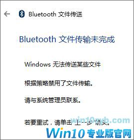 在带有蓝牙的笔记本电脑中,不少用户喜欢使用蓝牙来传输资料,只需配置好之后就可以进行传输了,无需使用数据线连接,相对来说还是比较方便的,但是确定就是传输速度有限。但是有用户反应称在win10系统中使用蓝牙输出资料的时候遇到了错误情况,提示:bluetooth文件传输未完成 ,windows 无法传送某些文件 根据策略禁用了文件传输。 请与系统管理员系统。这时什么情况?