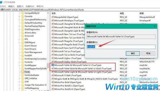 3、在右边找到Microsoft YaHei & Microsoft YaHei UI (TrueType)把后面的msyh.ttc改为你想要的字体文件名(右键需要改的字体即可看到名字),左键双击打开,把“数值数据”更换成前面复制的值,重启电脑,系统默认字体就更换好了。字体的话大家可以通过打开C:\Windows\Fonts 进行查看!
