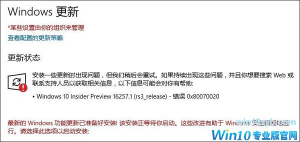 在Windows 10操作系统中更新升级的时候遇到问题无法更新,提示:安装一些更新时候时出现问题,但我们稍后会重试。如果持续出现这些问题,并且你想要搜索web或联系支持人员以获取相关信息,以下信息可能会对你有帮助: windwos 10 XXXXX 错误0x80070020