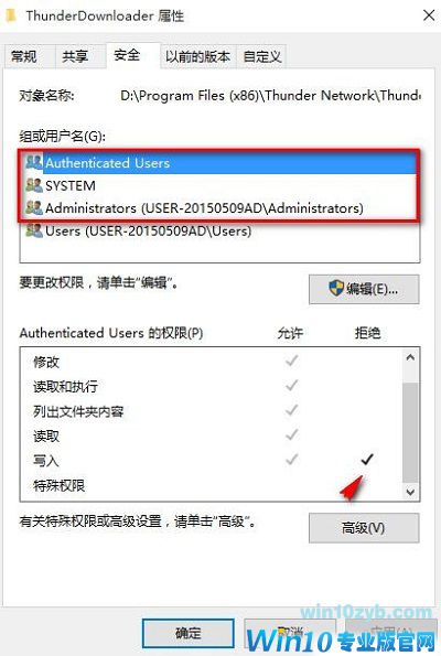 4、设置ThunderDownloader目录权限,禁止写入。(红框内的用户或组都勾选拒绝写入),如下图所示,切换到 安全选卡,然后点击 编辑 ,选中当前用户账户,然后在下面 XXX的权限窗口中找到写入权限,点击后面的拒绝 ,然后点击 确定 -- 确定 保存设置即可。