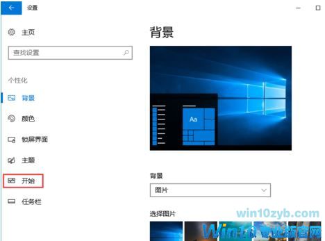 3、在【个性化】的选项卡中切换到【开始】选项界面,如图: