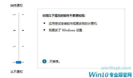 4、在弹出的用户账户控制设置,将滑块移动到最底部,点击确定保存设置即可!