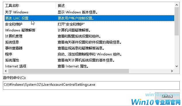 3、在工具框中选中 更改 UAC 设置 ,然后在下面点击【启动】按钮;