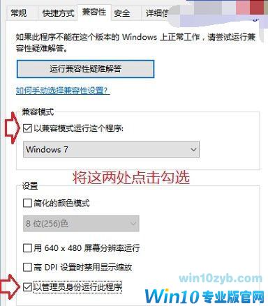 3、在PS属性对话框,点击切换到“兼容性”选项卡,点击勾选“以兼容模式运行这个程序”(建议选择Windows 7),接着在下面的设置栏中勾选“以管理员身份运行此程序”再点击确认(这个一定要勾选,不然还有可能出现配置错误)。,点击“确定”按钮保存设置即可。