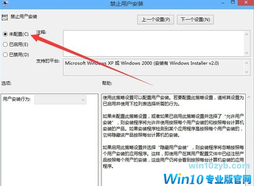 七、 我们把该项设置为“未配置”或是“已禁用”,然后点击确定按钮保存退出,这样以后就可以正常安装软件了。
