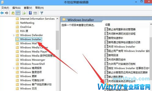 五、 在打开的Windows组件菜单项中找到“Windows Installer”菜单项,在右侧找到“禁止用户安装”一项。