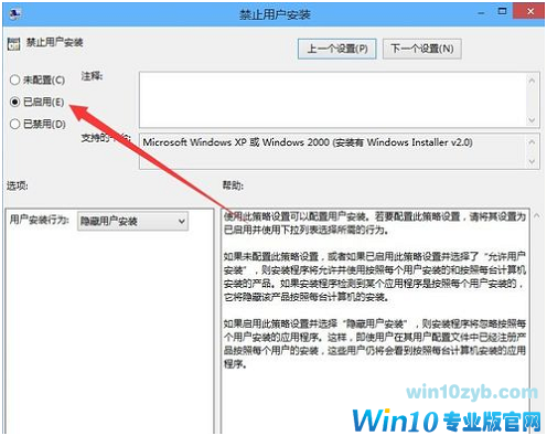 六、 双击可打开“禁止用户安装”的编辑窗口,可以看到该项设置为“已启用”,这就是导致不能正常安装软件的原因。