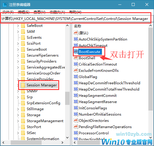 2、在编辑器左侧列表中,对应着找到计算机\HKEY_LOCAL_MACHINE\SYSTEM\CurrentControlSet\Control\Session Manager,然后在右侧找到BootExecute,双击并打开;