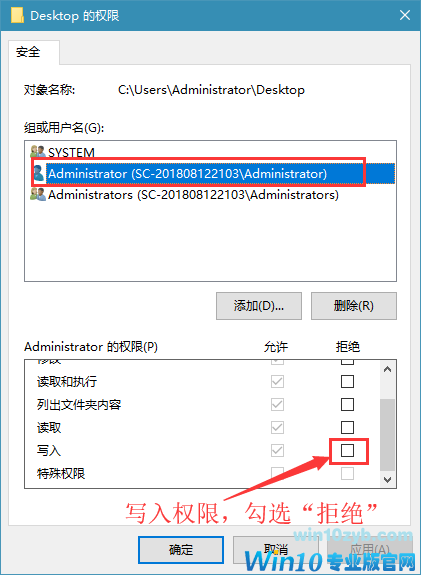 3、如图在桌面权限中,勾选系统登陆账户的拒绝写入权限,然后“确定”;