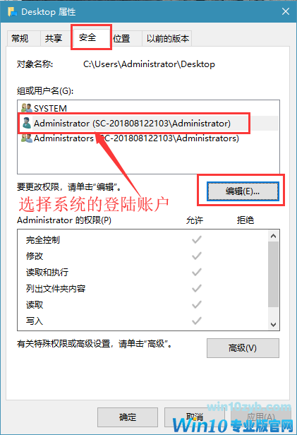 2、在桌面属性中,找到安全下的,选择系统登陆的账户,点击编辑,来更改权限;