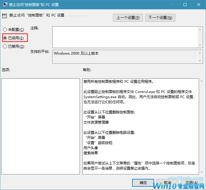 3、点击“已启用”,开启禁止访问控制面板和PC设置功能;