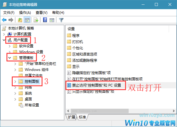 2、在本地组策略中找到“用户配置”-“管理模板”-“控制面板”,右侧找到“禁止访问“控制面板”和PC设置”;