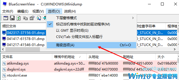 5、只要您在高级选项里选择正确的转储文件夹,BlueScreenView也可让您查看另一个Windows中的崩溃数据。在“选项”菜单选择“高级选项”: