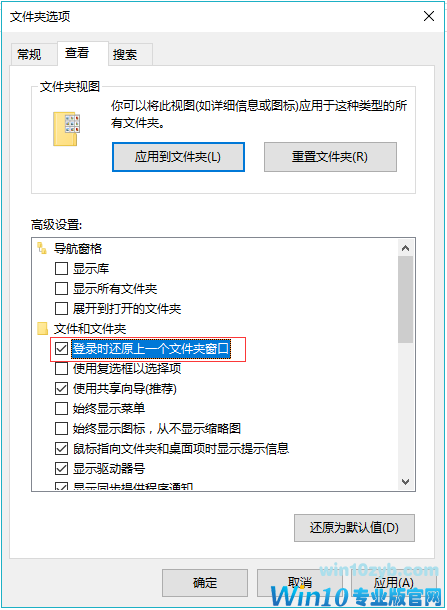 在“查看”选项卡中选中“登录时还原上一个文件夹”复选框。此后,计算机在重启后便可以打开之前的窗口。
