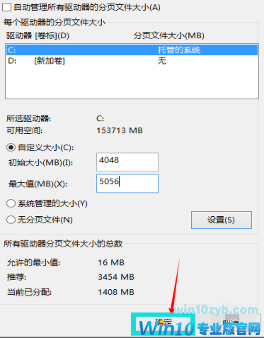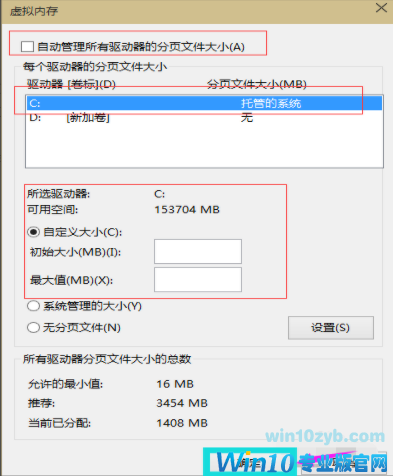 5.将虚拟内存界面中的勾去除,选择“自定义”,托管的系统选择C盘。