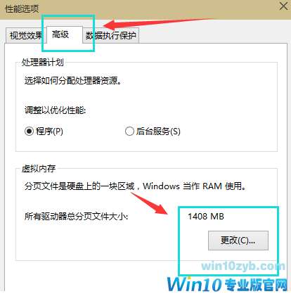 4.在“性能选项”界面中切换到“高级”,选择“更改”打开。