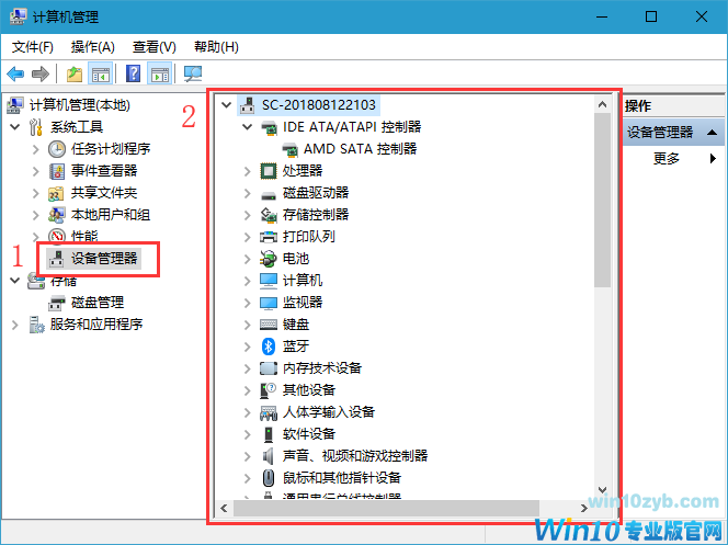 2、在计算机管理中,在左侧找到设备管理器,点击选择后,右侧就显示出电脑硬件状态的信息;