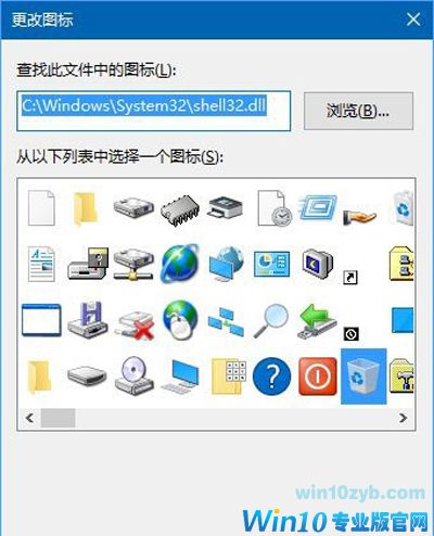 5、点击上方的“浏览”,选取系统盘\Windows\system32\shell32.dll,然后就可以看到很多系统图标,你可以选择“回收站”图标(选空的还是有纸的看你喜好),也可以选其他的;