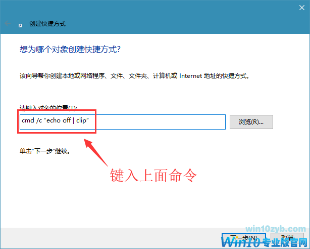 2、这里键盘“cmd /c “echo off | clip”命令到输入框中去,点击“下一步”;