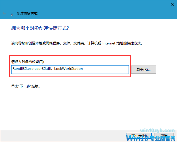 2、在创建方式框口里输入“Rundll32.exe user32.dll,LockWorkStation”命令,如下图;