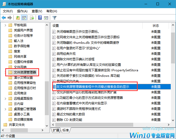 2、在本地组策略中我们要相应找到,“用户配置--管理模板--Windows组件--文件资源管理器”下的“在文件资源管理器搜索框中关闭最近搜索条目的显示”,并双击打开进行编辑;