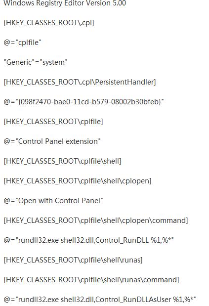 新建txt文本文档,将以下文字复制到txt文档中,并将文件重命名为cpl.reg(去掉原txt后缀)保存。双击cpl.reg导入注册表。