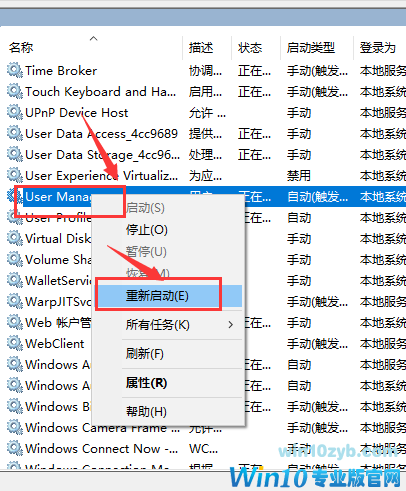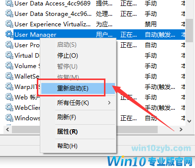 4.回到【服务】窗口,这次选中【User Manager】鼠标右击,在弹出来的列表中,选择【重新启动】即可